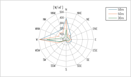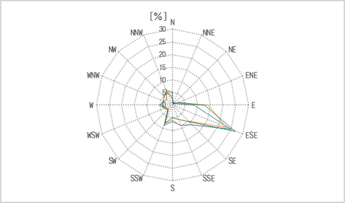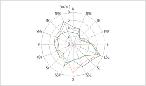 風況データは、グラフや表を用いて視覚的に整理し、風の傾向や変化をわかりやすく示します。こうした情報をもとに、事業計画の検討や意思決定に必要な判断材料として活用できる形で提供しています。